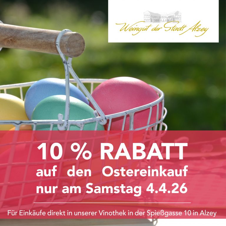 Auch wir haben ein kleines Osterpräsent für Sie. Für Sie gibt es 10 % Rabatt auf Ihren Ostereinkauf am 4.4.26 bei uns in der Vinothek. Das Angebot gilt nicht für Onlinekäufe.